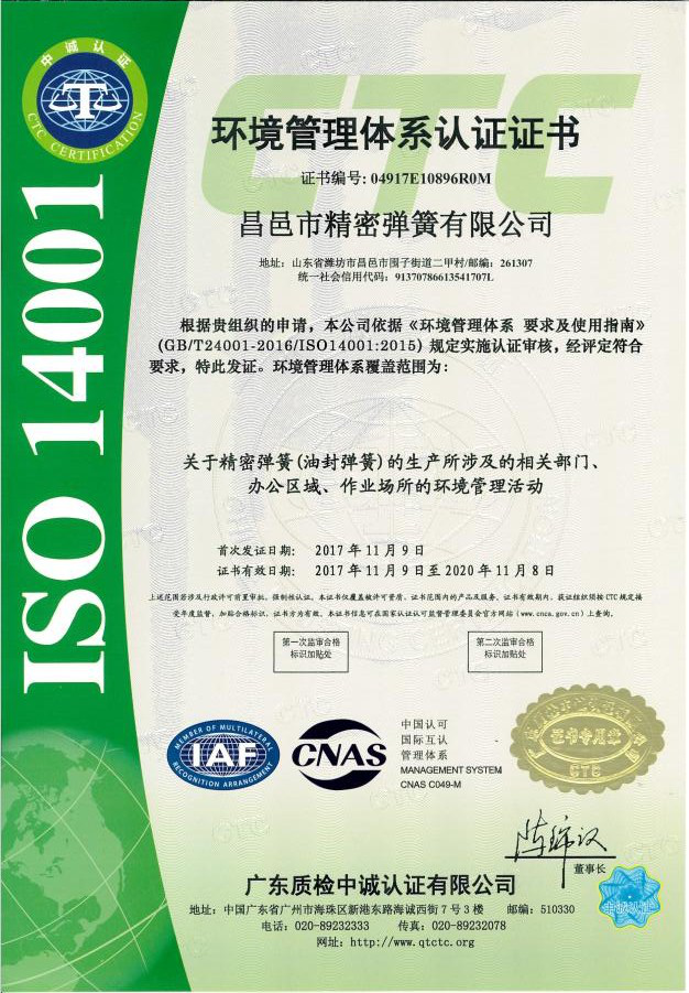 2017年昌邑市精密彈簧有限公司通過ISO14001環(huán)境管理體系認證。