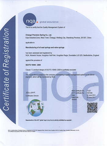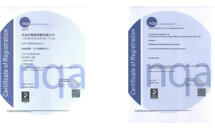 Changyi Precision Spring Co.,Ltd has passed the ISO14001 Environmental management system certification in 2015.